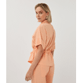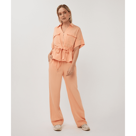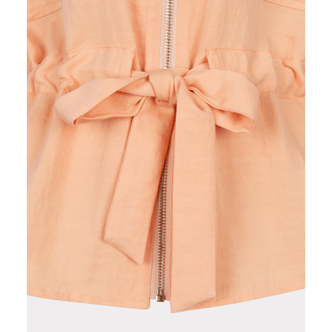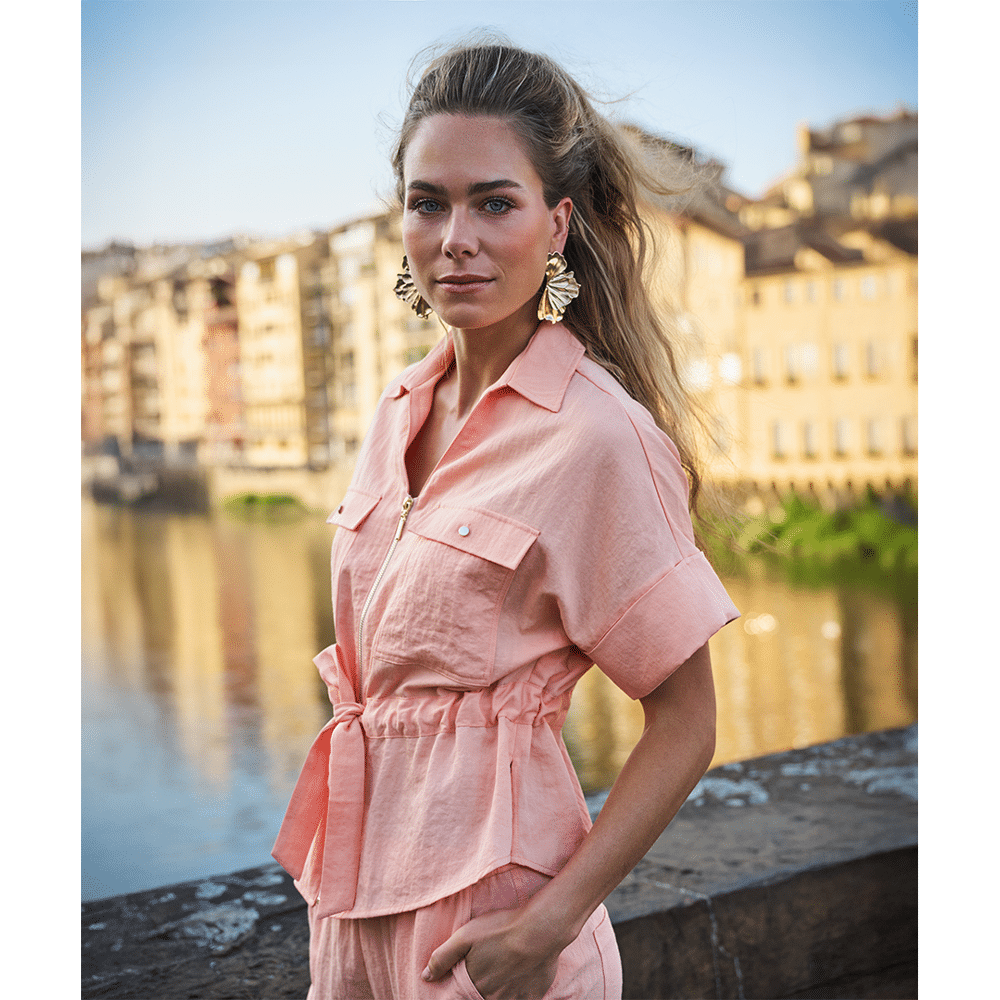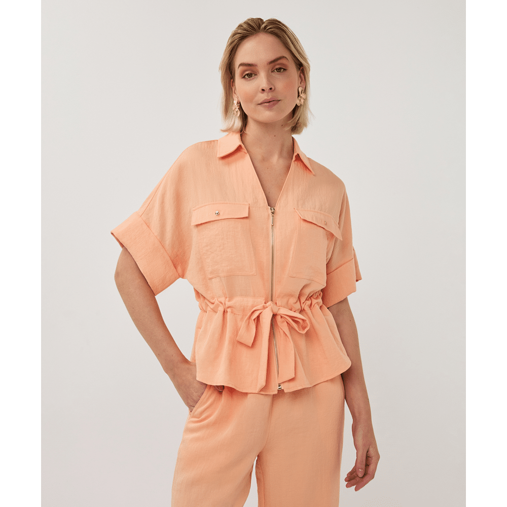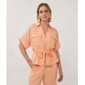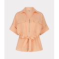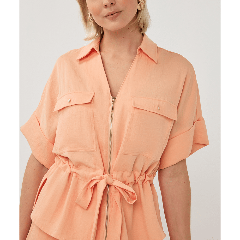 Stoere blouse met halve mouwen, gouden of zilveren rits, cargozakken met drukknopen en een strikceintuur in de taille. De blouse is gemaakt van 80% rayon en 20% nylon.